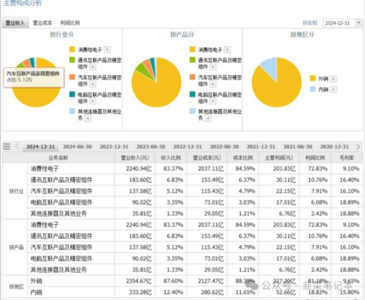 但是整体业务对苹果依赖度仍过高。2024公司主营业务上,消费电子业务上,苹果依旧是最大客户,尽管公司通过跟三星、小米供应链合作,把非苹果收入占比提升至25%。但财报数据显示,2024年,立讯精密的前五大客户贡献了公司近80%的收入,合计达2110亿元,其中最大客户苹果独占1901亿元,占比高达70.74%,客户集中度过高的问题显著。
