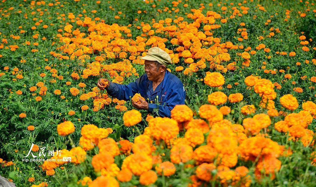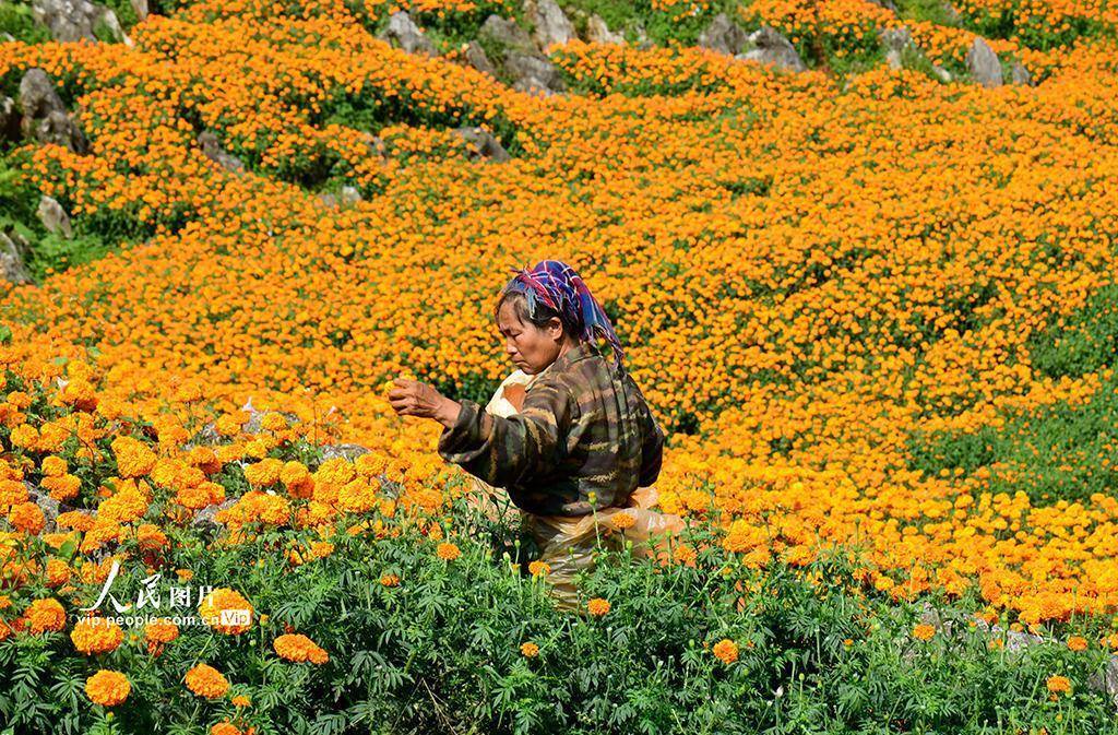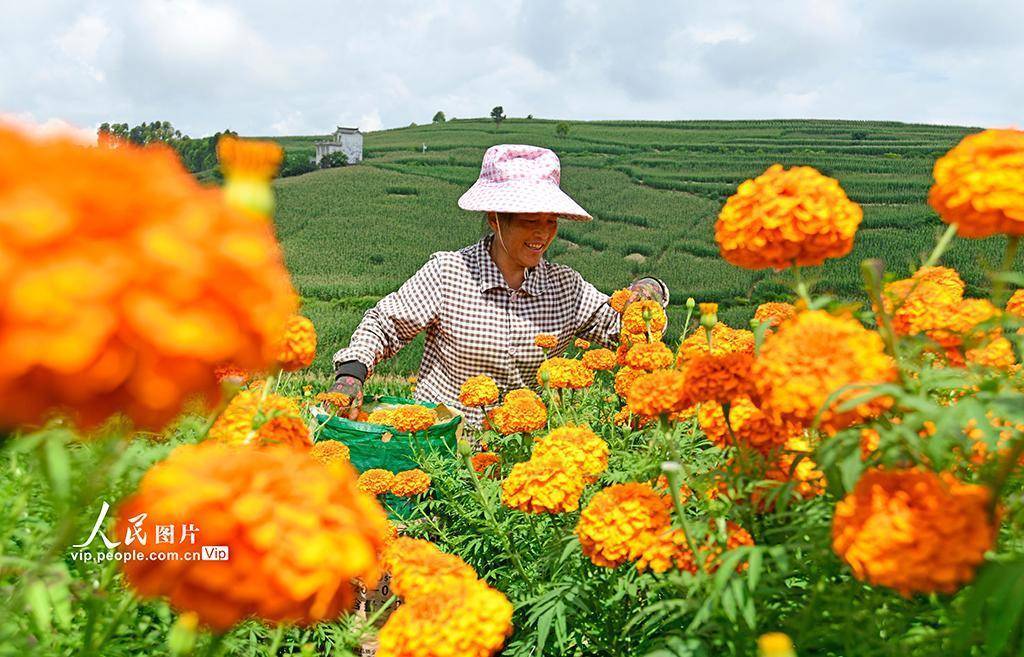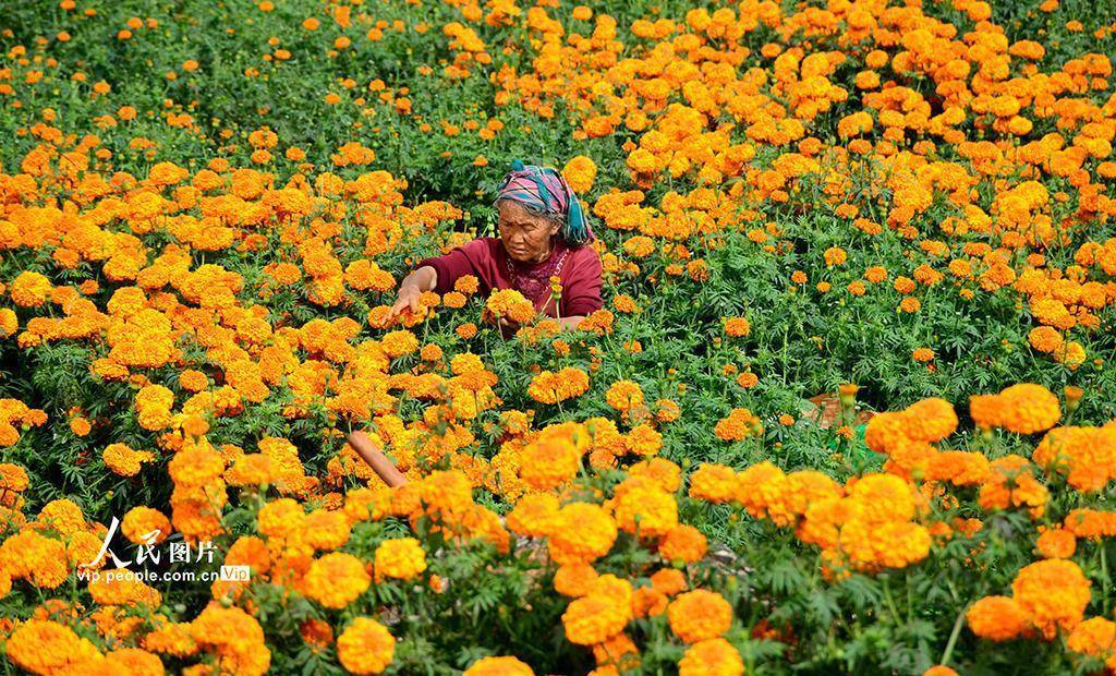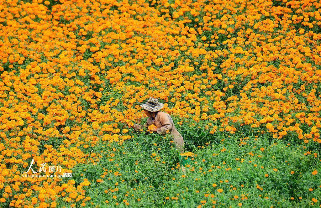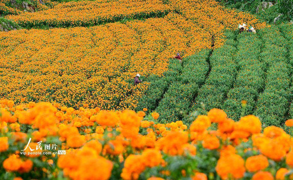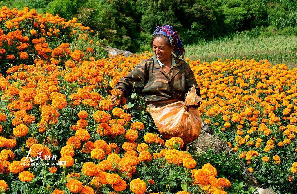 近年来,弥勒市立足山区资源禀赋,引导农民因地制宜发展万寿菊产业,以党建为引领,构建“公司 + 农户”的产业发展模式,带动农民增收致富,助力乡村振兴。普佳勇摄(人民图片网)